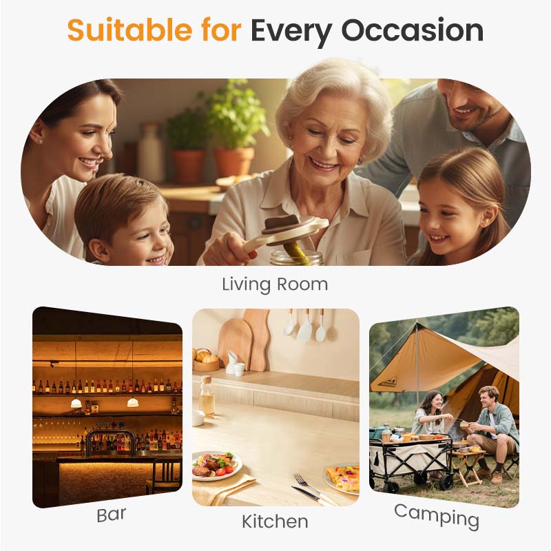 4-V-1 MULTIFUNKČNÍ NÁSTROJ: Spojuje čtyři základní kuchyňské nástroje v jednom kompaktním zařízení, včetně otvíráku na sklenice, otvíráku na láhve a dvou otvíráků na šroubovací uzávěry, čímž šetří cenné místo v zásuvce a zjednodušuje kuchyňské úkoly.